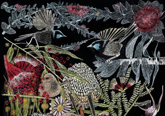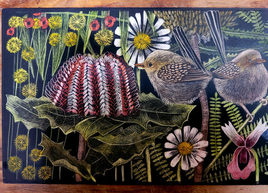 Original scratchboard 'Where the fairy wrens live'